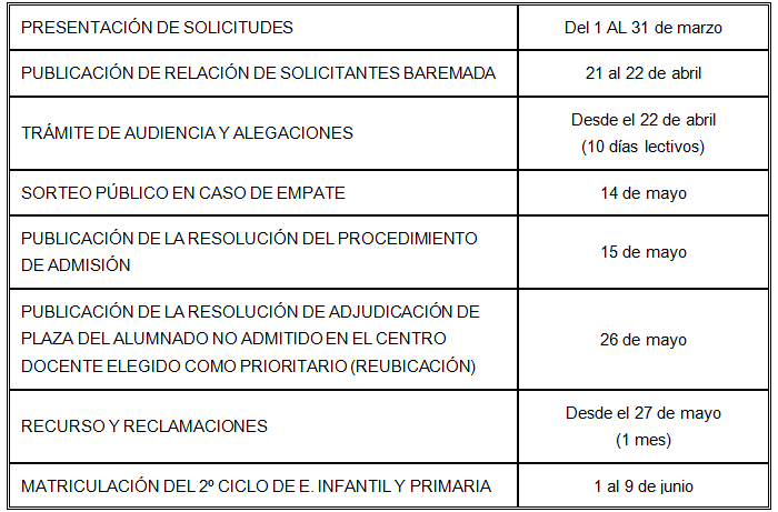 proceso de admisión la Consejería de Educación y Deporte ha